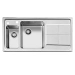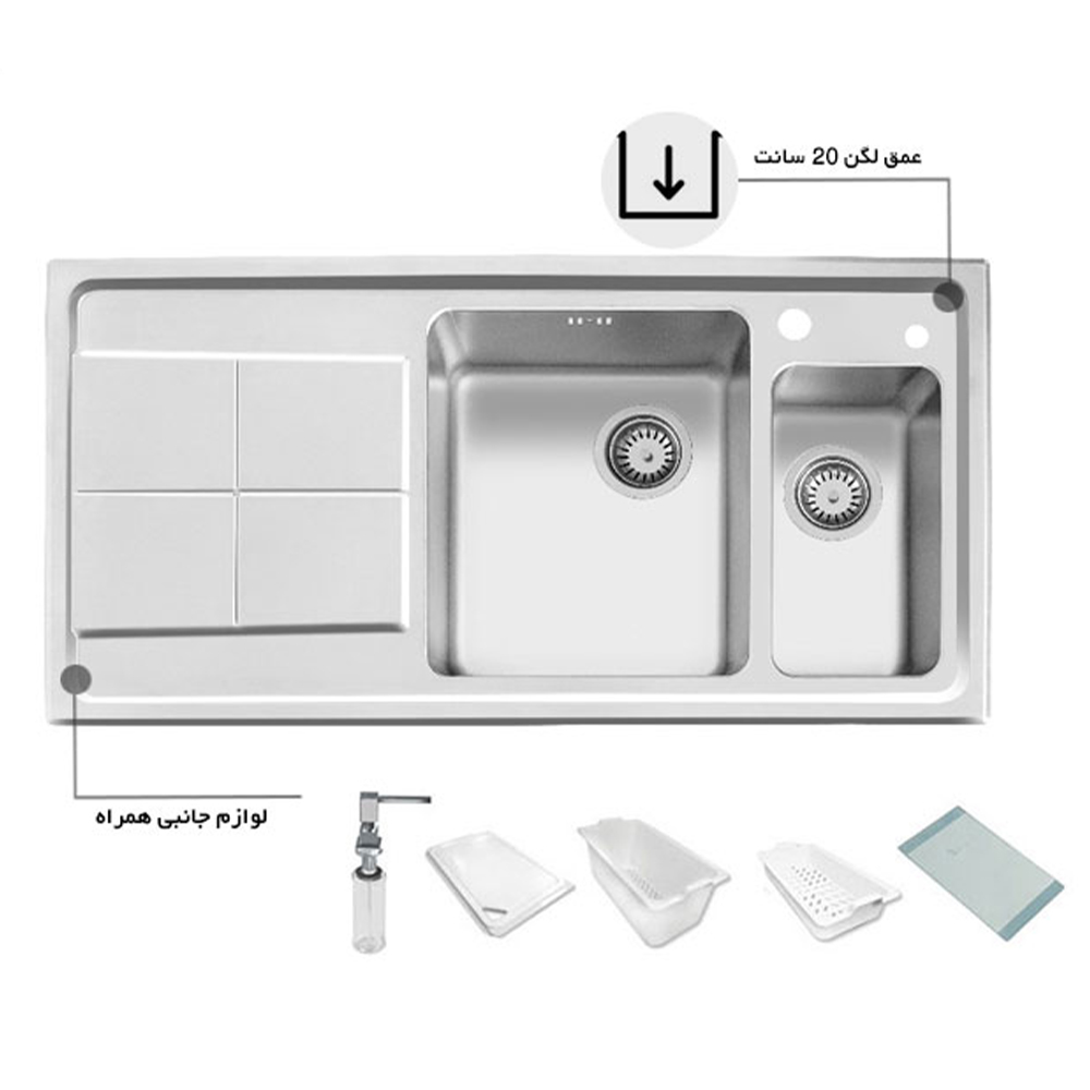 سینک اخوان توکار 306 با کیفیت بسیار عالی و ورق 1 میلیمتری و عمق لگن حدود 20 سانتی متری با طرح سینی بدون سر ریز به همراه یک لگن و میوه شور ابعاد این محصول 100 در 50 سانت میباشد