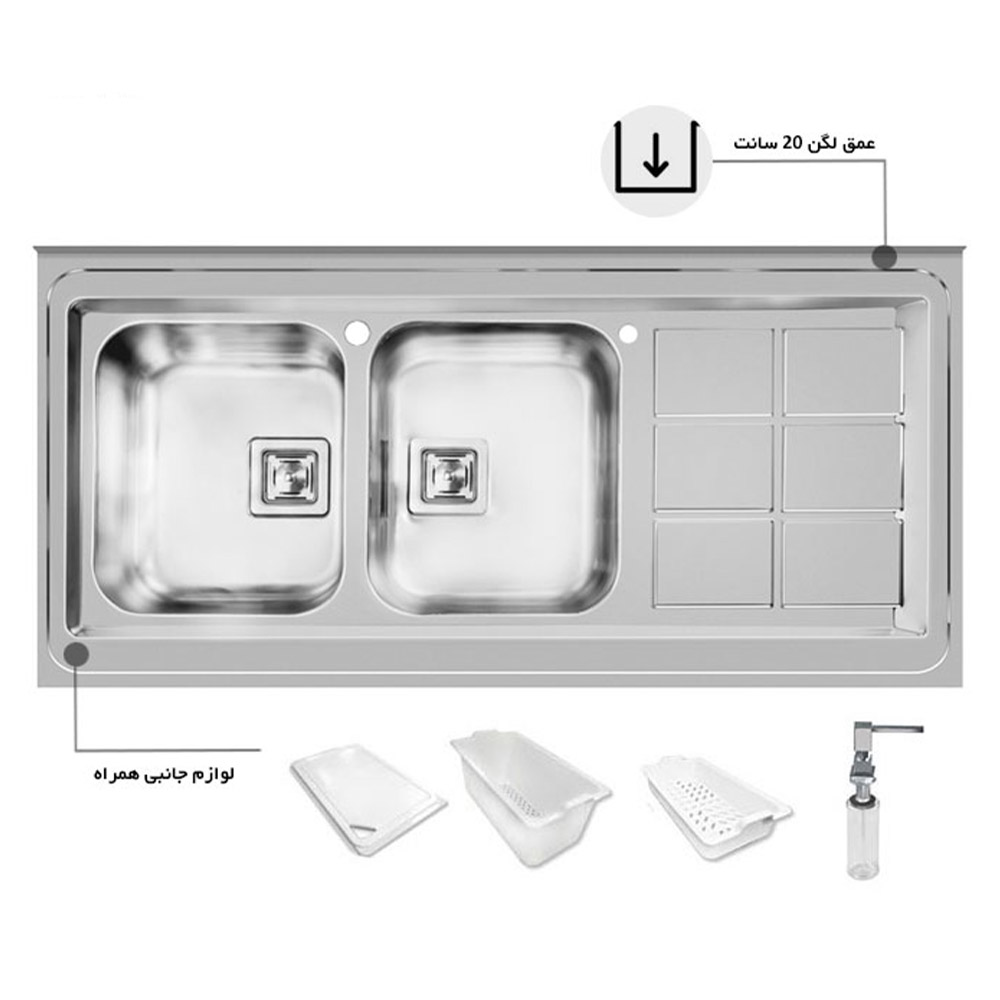 سینک اخوان روکار 502 این محصول دارای ابعاد 120 در 60 سانت و طرح لگن R70 میباشد. از ویژگی های این محصول میتوان به عمق لگن مناسب به همراه جامایع متصل بر روی محصول اشاره نمود