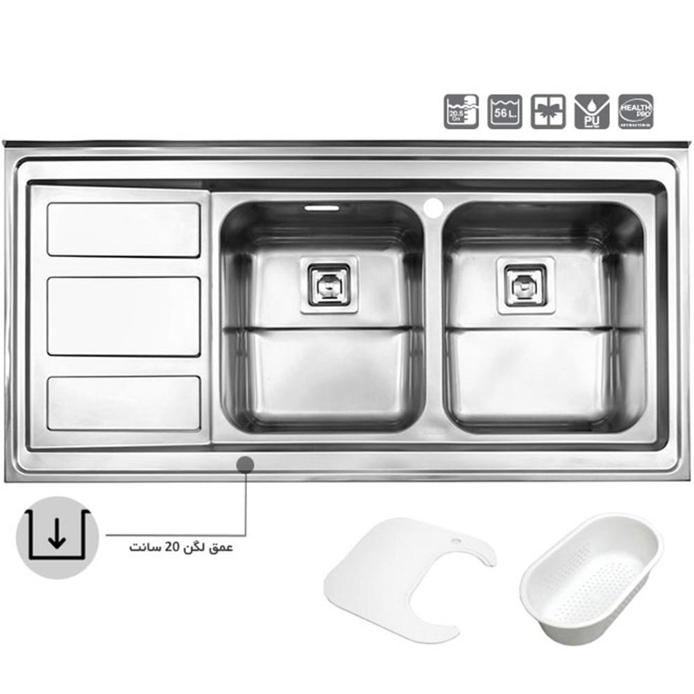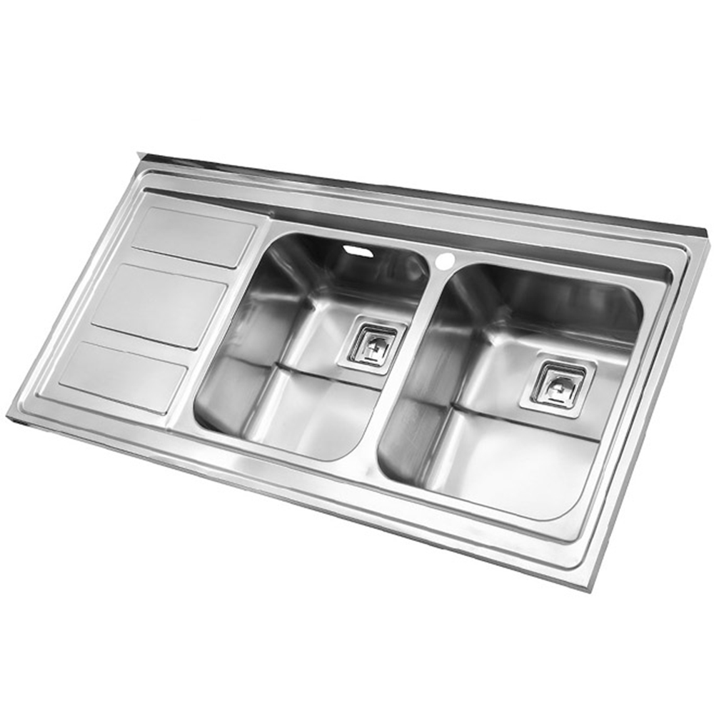 سینک استیل البرز 765 روکار این محصول دارای سایز 120 * 60 سانتی متر و عمق لگن 20 سانتی متری میباشد. که در مدل های لگن چپ و راست به انتخاب مشتری تولید میگردد. از ویژگی های این مدل میتوان به زیراب فانتزی مربع اشاره نمود
