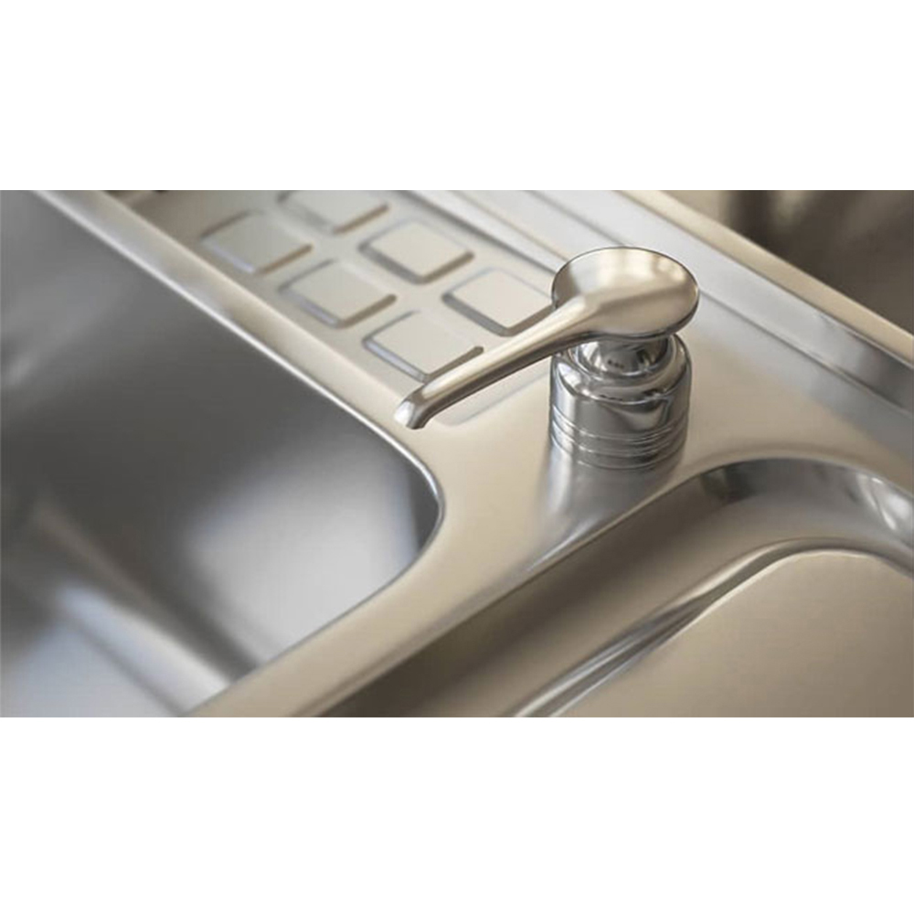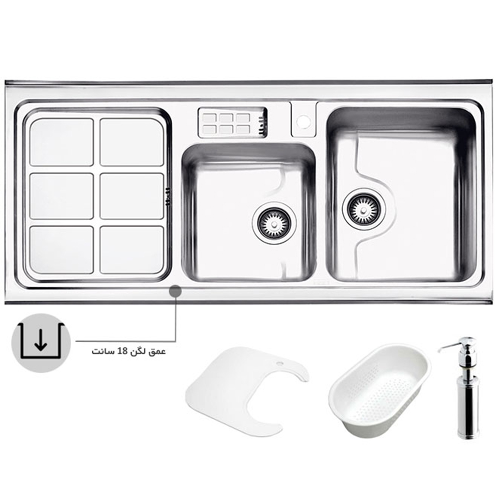 سینک استیل البرز 855 روکار با ابعاد 120*60 سانتی متر همراه با جا مایع و جا اسکاجی بر روی سینک این مدل سینک بسیار پر فروش میباشد از ویژگی های بارز این محصول طراحی لگن با گنجایش بالای آن است