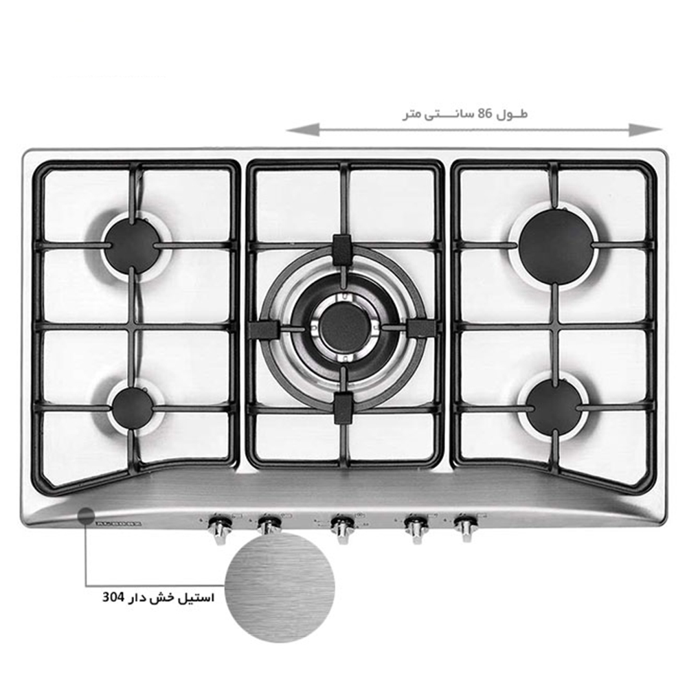 گاز استیل البرز مدل S 5906 با نمای استیل و دارای 5 شعله به همراه شعله پلوپز وسط این اجاق گاز دارایی قطعات اصلی ساخت کشور ایتالیا میباشد. طراحی این محصول قابلیت گرم نشدن ولوم ها را دارا میباشد