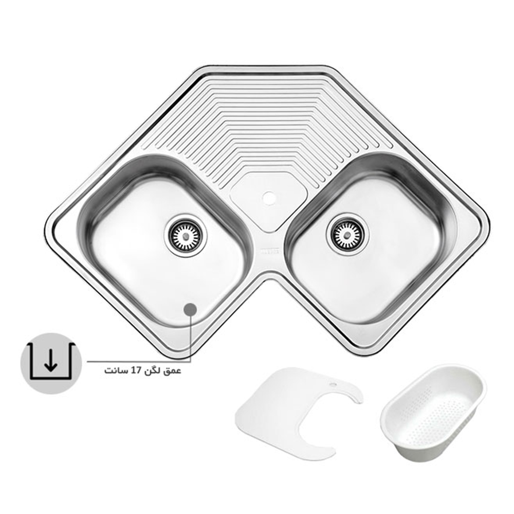 سینک استیل البرز 540 گوشه با نصب توکار و دو لگن و یک سینی در وسط تولید میگردد. این محصول بدون لگن چپ و راست با سیفون زیراب بزرگ میباشد