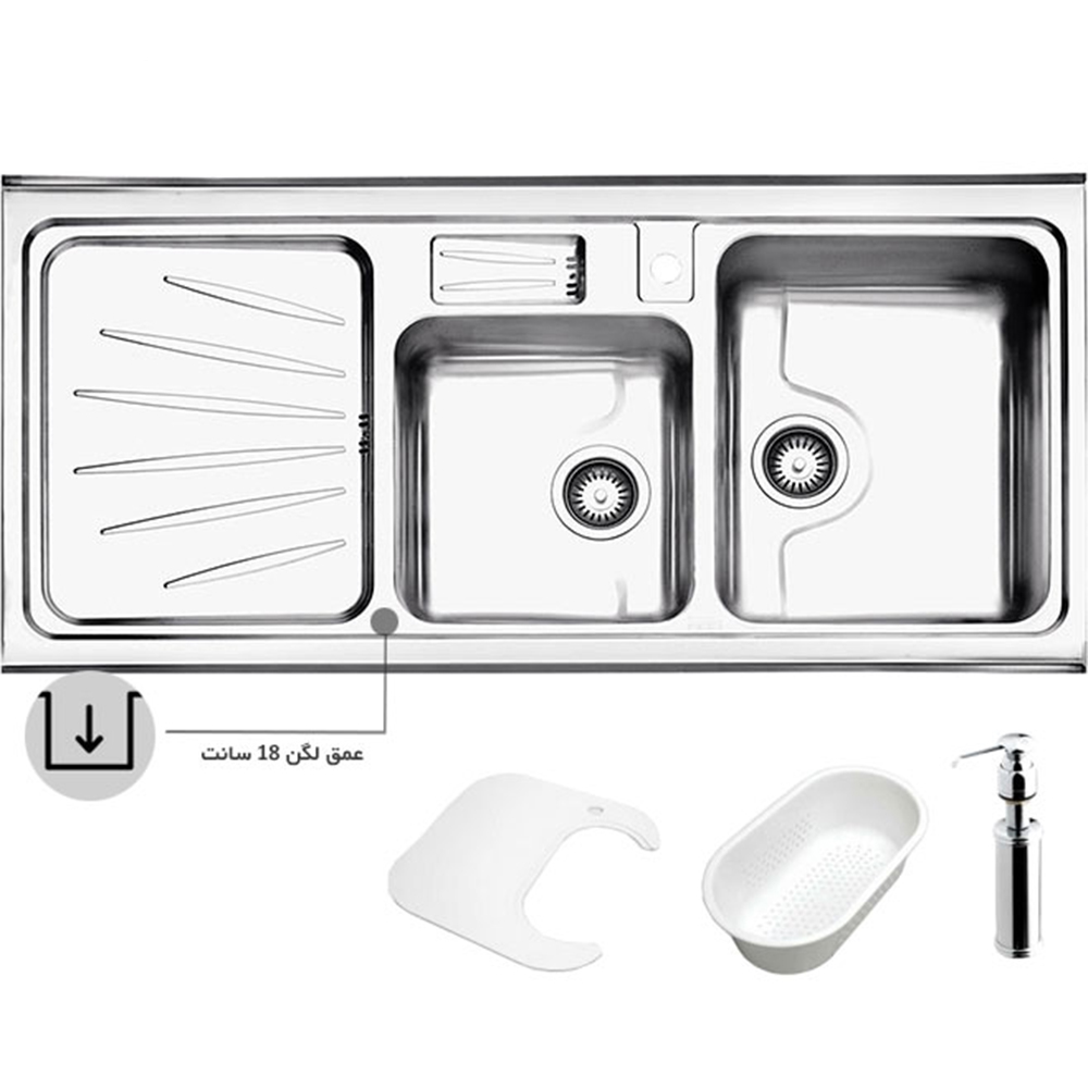 سینک استیل البرز 814 روکار با ابعاد 120*60 سانتی متر همراه جا مایع و جا اسکاجی بر روی سینک. یکی از سینک های پر فروش و با کیفیت مناسب کارخانه استیل البرز. عمق لگن این سینک 18 سانتی متر است
