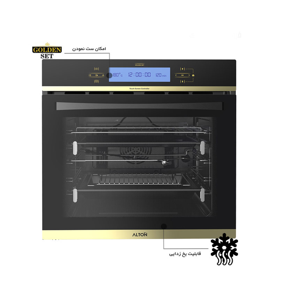 فر توکار آلتون V304N برقی این فر دارای حجم داخلی 72 لیتر و درب 4 جداره جداشونده و صفحه نمایشگر دیجیتال لمسی 304N آلتون همچنان دارای 11 برنامه پخت و سیستم پخت سریع و ذخیره برنامه دلخواه و قفل کودک و تایمر پیشرفته زمان پخت و برنامه یخ زدایی و فن گردش هوای داغ و فن خنک کننده اتوماتیک و ریل تلسکوپی میباشد و دارای زیبایی چشم نواز با ترکیب رنگ مشکی و طلایی به دست آورده است