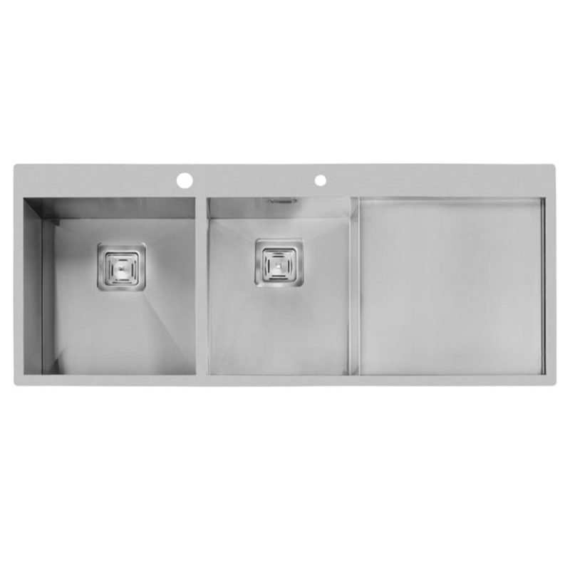 سینک اخوان توکار 357 دست ساز دارای ورق 1 میلیمتری ساخت ایتالیا با لگن های دست ساز ( بدون پرس ) . این محصول دارای مزایای ضخامت ورق بسیار عالی آن حتی در لگن ها و عیب آن تمیز کردن سخت در گوشه های لگن میباشد.