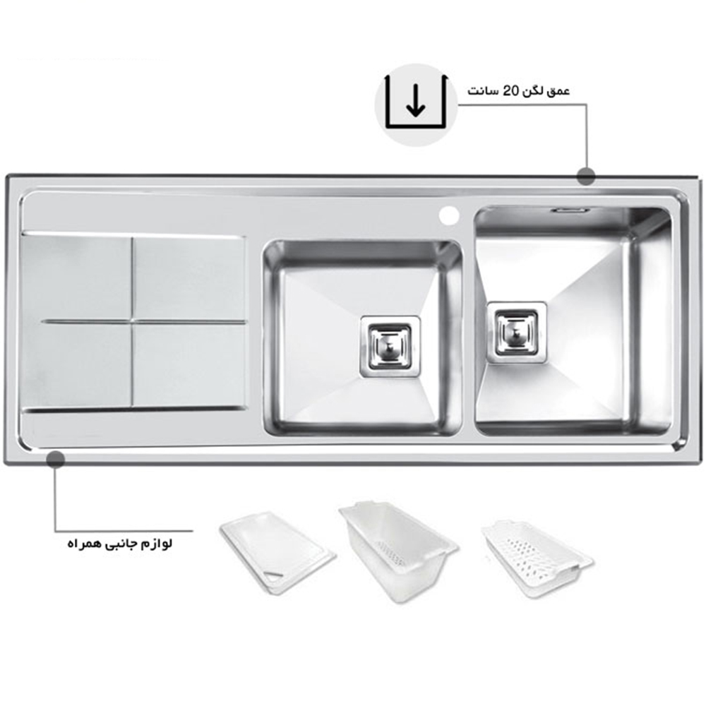 سینک اخوان توکار 300s دارای دو لگن است.این سینک از جنس استیل ضد زنگ به قطر 1 میلیمتر ساخته شده طول آن 120 سانت و عرض آن 50 سانت است. سینکهای این کارخانه دارای 10 سال ضمانت شرکت اخوان از تاریخ فاکتور می باشند .
