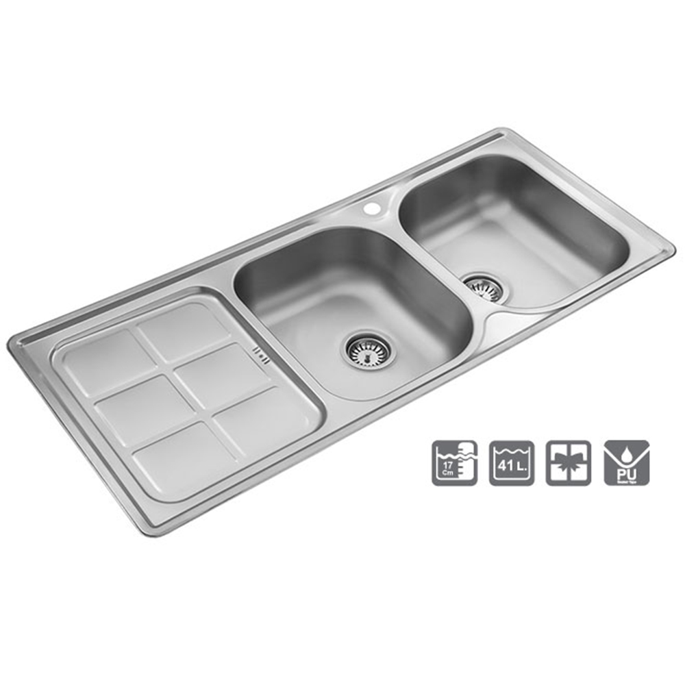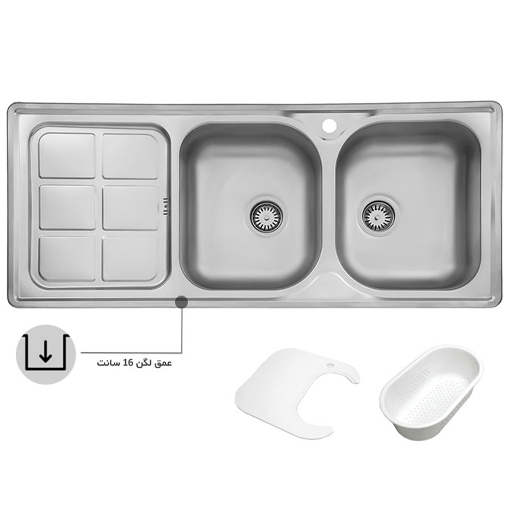 سینک استیل البرز 215 توکار این مدل دارای ابعاد 120 * 52 سانتی متر با عمق لگن 16 سانتی متر دارای لگن چپ و راست به انتخاب مشتری با طراحی سینی ساده و زببا