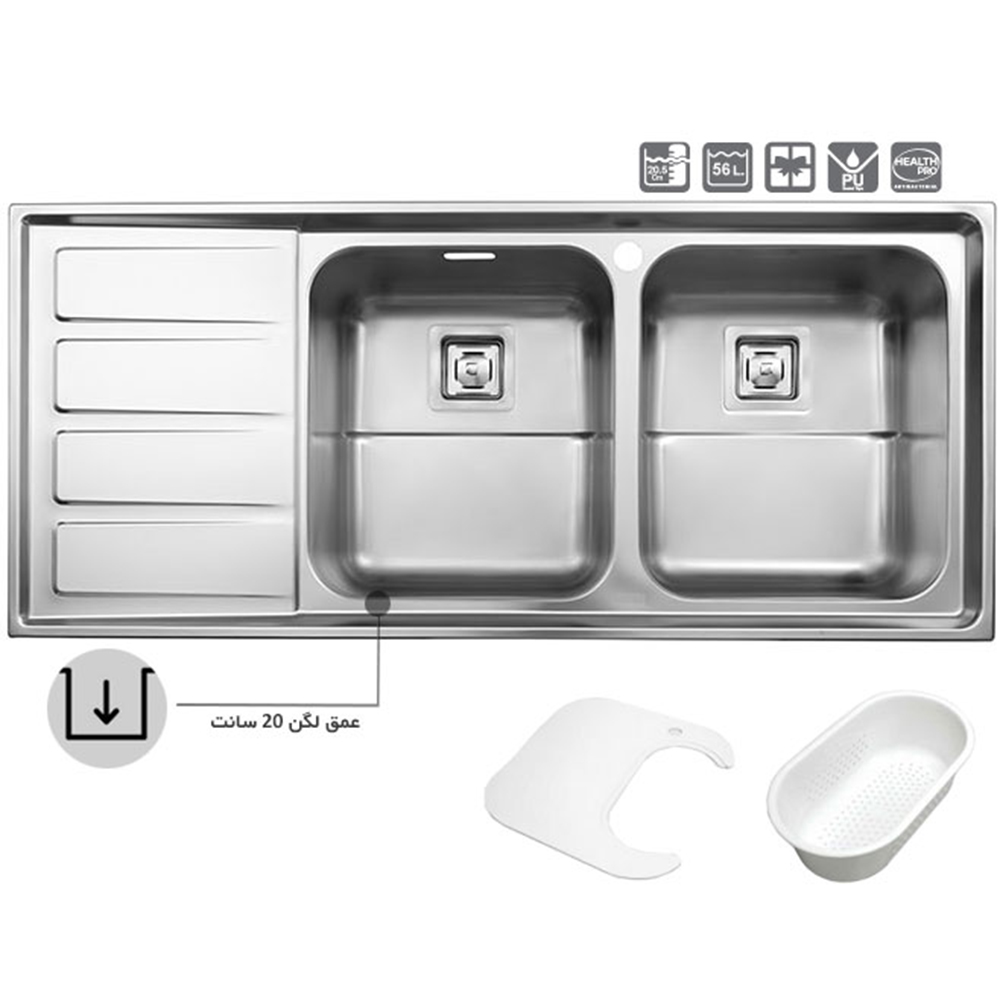 سینک استیل البرز 764 توکار این محصول دارای لگن عمیق 20 سانت و ابعاد 116 * 52 سانتی متر میباشد. سینک های استیل البرز دارای 10 سال ضمانت از تاریخ فروش میباشند. زیرآب، کاملاً استیل است که با داشتن آب بند به صورت دستی باعث کنترل خروجی آب سینک میشود. همچنین با بستن خروجی آب میتوانید به راحتی آب را در لگن سینک جهت مصارف مختلف نگه دارید