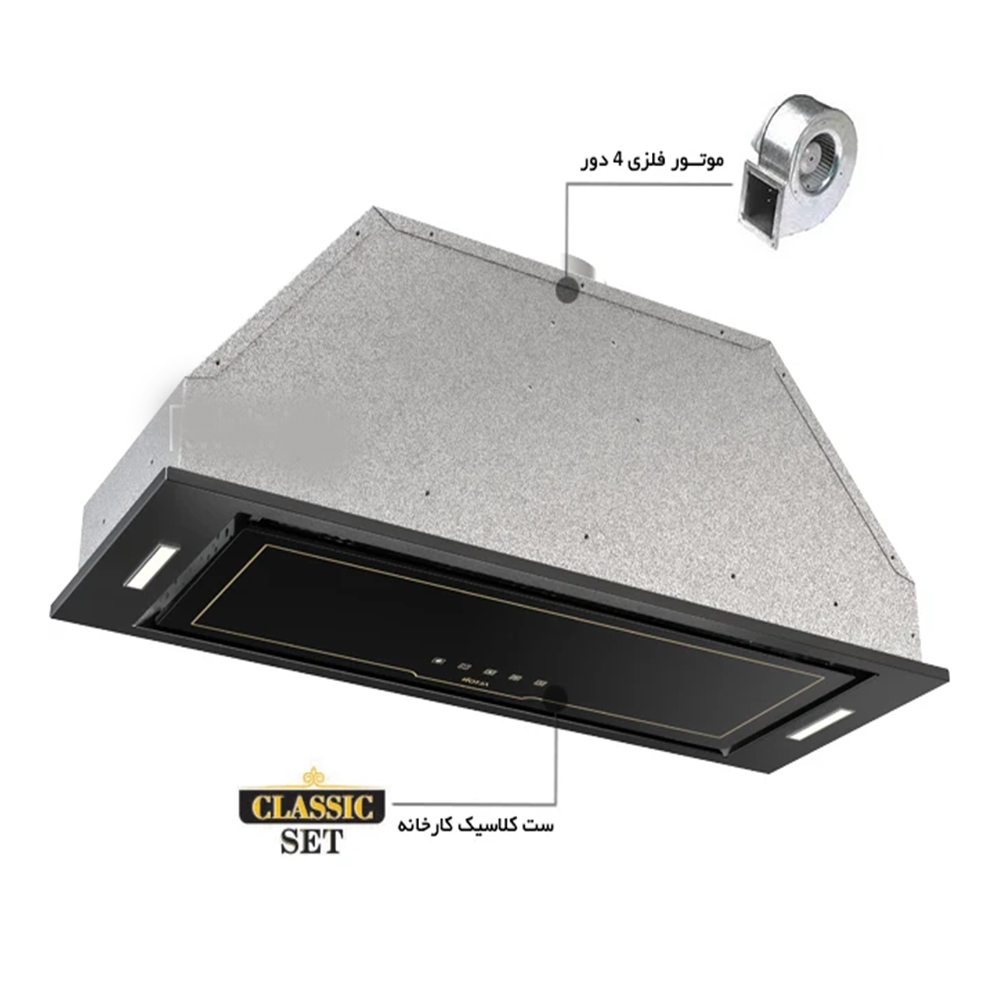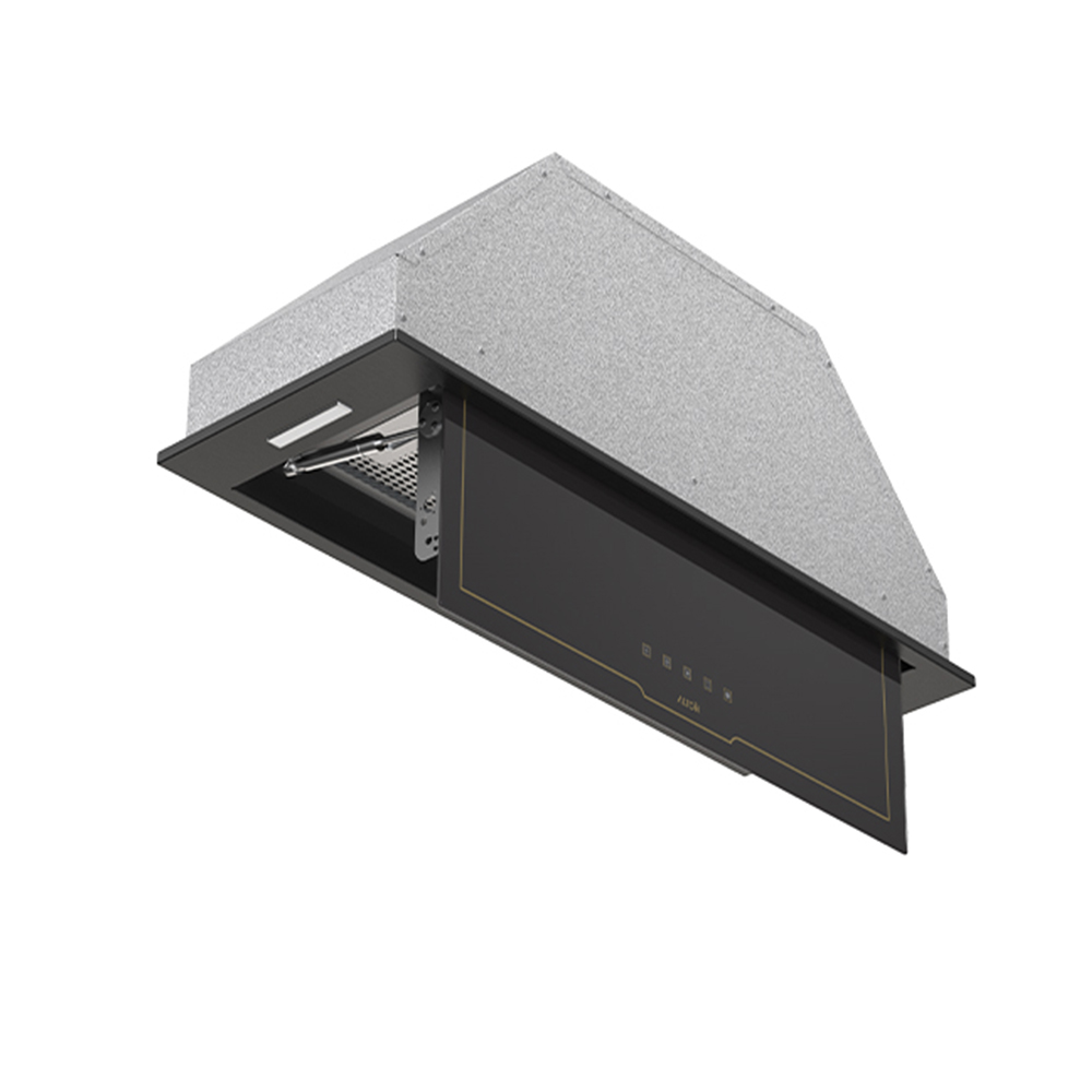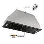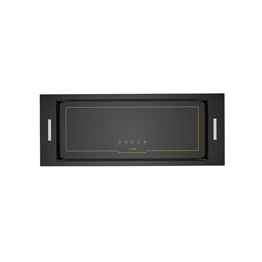 هود آلتون مخفی H604 B این مدل هود آشپزخانه دارای موتور فلزی 4 دور به همراه نمای شیشه سکوریت مشکی با خطوط طلایی. این محصول ارای جک گازی بر روی درب میباشد