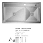 سینک مدل B90S توکار این محصول وارداتی از کشور ترکیه به صورت دولگن با یکی بزرگ و دیگری کوچکتر با ابعاد 90 * 50 سانتی متر و کیفیت فوق العاده بالا میباشد. از ویژگی های بارز این محصول میتوان به عمق لگن فوق العاده 24 سانتی متری و پله مجزا برای محل نصب شیر برای جلوگیری از پاشیدن آب روی صفحه کابینت اشاره نمود. ضخامت ورق یک میلیمتر این محصول از ویژگی های قابل توجه این محصول میباشد.